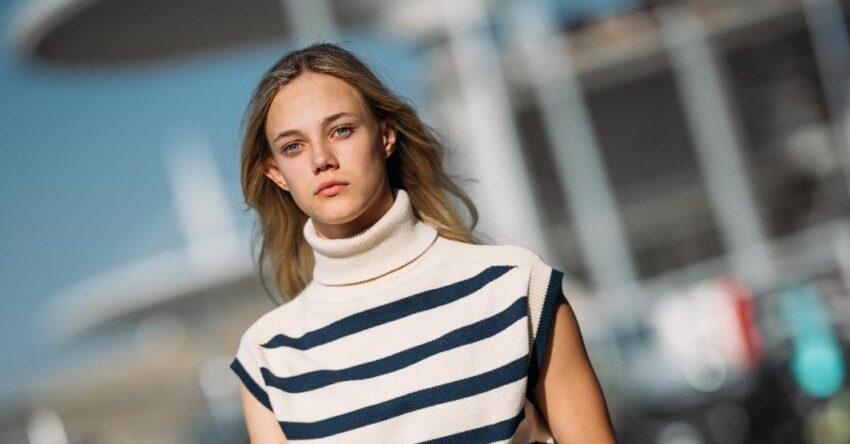 Alba Larsen a purtat un pulover fără mâneci, cu guler rotund și dungi breton împreună cu blugi largi din denim din colecția Sofia for Tommy, asortate cu teniși albi din colecția de primăvară 2025 TOMMY HILFIGER.