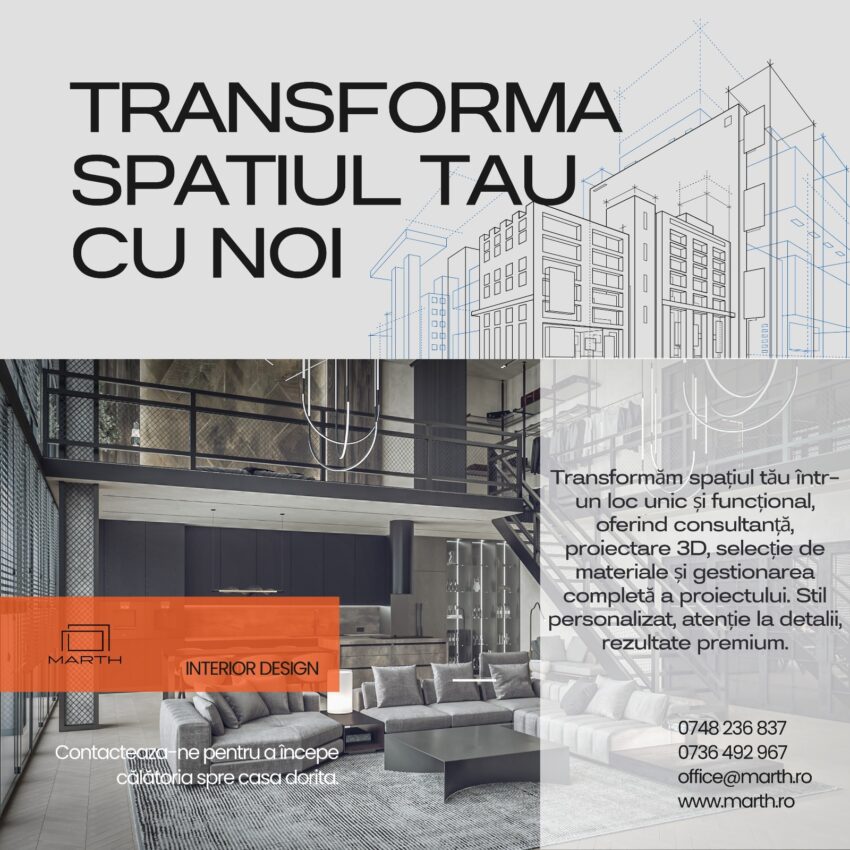 Dacă îți dorești un spațiu amenajat care reflectă stilul tău, care este în același timp funcțional și estetic, nu ezita să contactezi Marth. Echipa noastră de designeri te va ghida pas cu pas în realizarea unui proiect de succes, care să îți îmbunătățească calitatea vieții sau să îți transforme afacerea într-un loc inspirațional. Indiferent de dimensiunea proiectului tău, Marth este pregătită să îți ofere cele mai bune soluții pentru amenajări interioare București.
